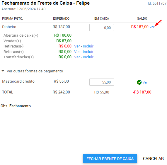 1. Acesse a tela de fechamento da frente de caixa e clique em 'Ver' ao lado da forma de pagamento desejada;