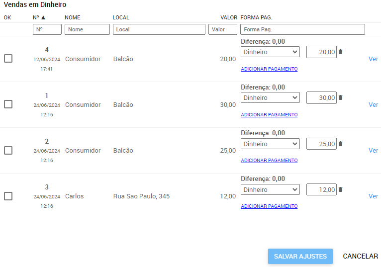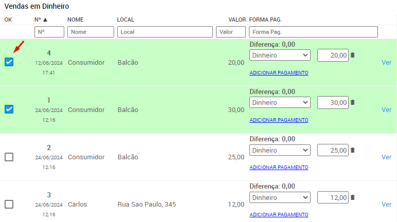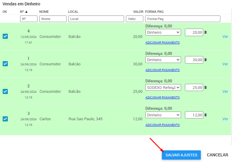3. Em cada uma das vendas você pode alterar a forma de pagamento, o valor pago e adicionar alguma nova forma de pagamento caso tenha sido dividido. Conforme for realizando a conferência de cada venda, sinalize com o OK, como indicado na imagem: