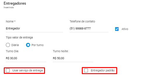 5. A caixinha 'Usar serviço de entrega' é para casos onde você está configurando uma integração de logística (Foody Delivery, Entrega Fácil, SODE e afins). Já 'Entregador padrão' é para quando você deseja que todas vendas vinculem-se ao mesmo entregador;