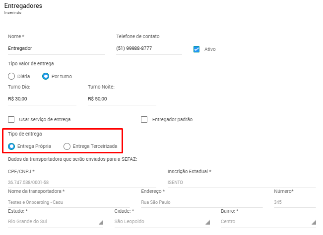 6. As opções de tipo de entrega, entre 'Entrega própria' e 'Entrega terceirizada' são para selecionar/incluir os dados cadastrais da empresa responsável pela logística. Se for do restaurante, marque 'Entrega própria'.
