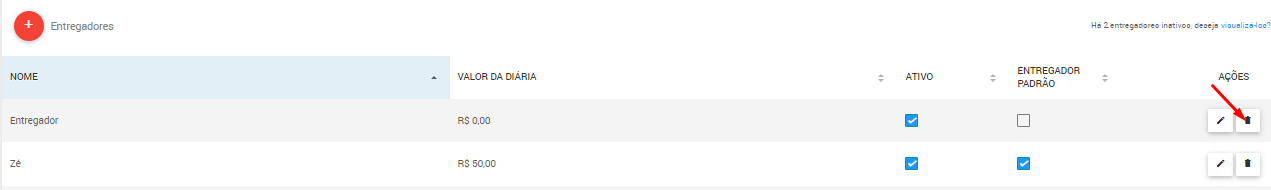 1. Em Menu > Entregadores, procure e clique no ícone de lixeira ao lado do nome da pessoa entregadora que você deseja excluir.