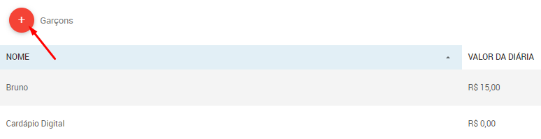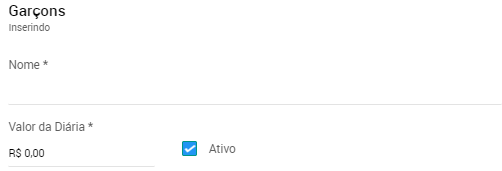 3. No campo 'Nome', insira o nome/identificação do novo garçom. No campo 'Valor da Diária', indique o valor base a ser recebido por dia trabalhado;