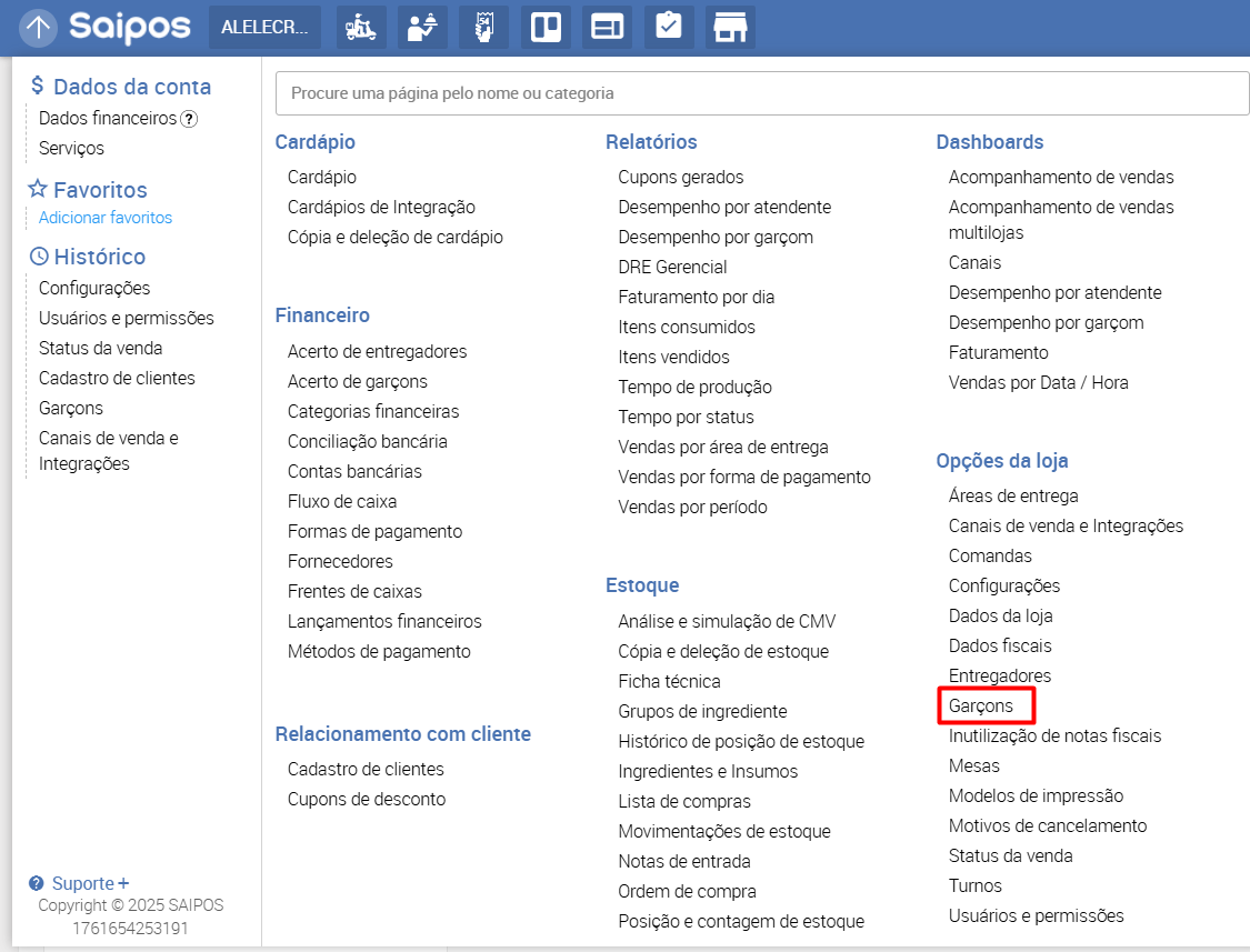 1. Na tela do sistema, acesse o Menu > Garçons;