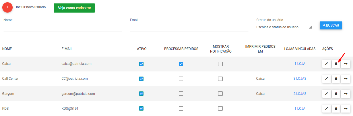 As permissões são encontradas e editadas em Menu > Usuários e permissões, clicando no 🔒 ao lado usuário desejado.