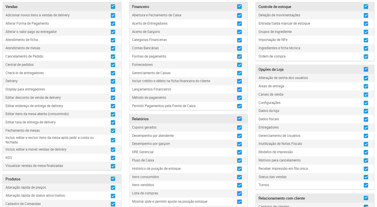 - Atendimento de mesas: Permissão para ter acesso ao lançamento de pedidos de Salão (mesas e comandas);
