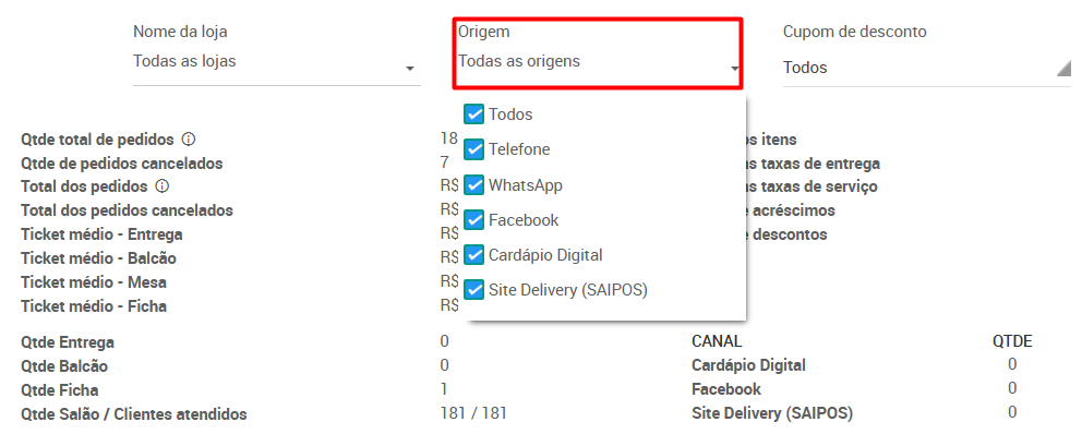 6. Em 'Origem', você poderá filtrar por canal de venda, incluindo plataformas integradas e canais de vendas lançadas manualmente no sistema;