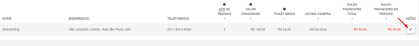 7. Para acessar o histórico deste cliente, clique sobre o lápis de edição conforme a imagem abaixo: