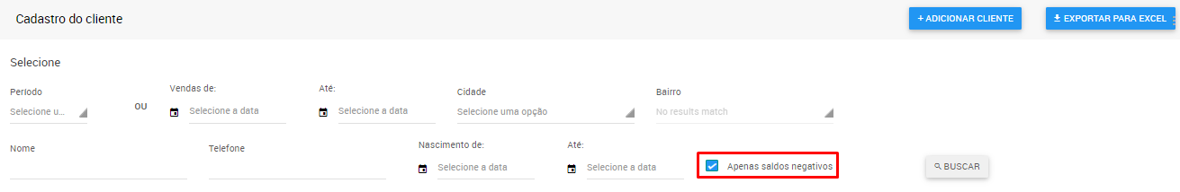 4. Marque o flag de 'Apenas saldos negativos' conforme exemplo abaixo: