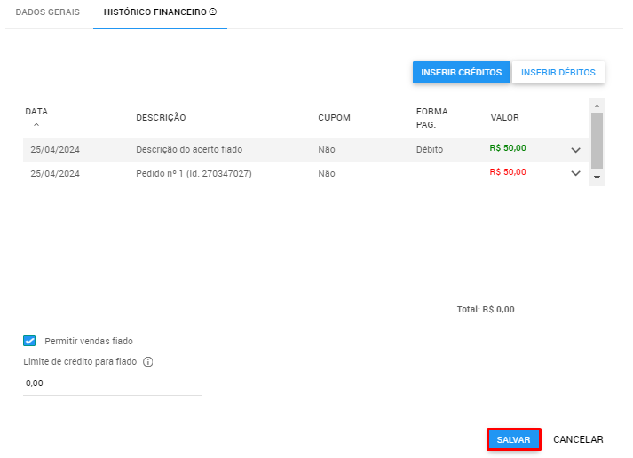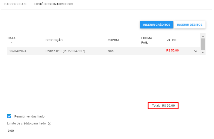 6. Com isso, o sistema irá mostrar o cadastro do cliente em questão que possui saldo devedor, ou seja, que teve venda(s) registrada(s) com a forma de pagamento 'Fiado'