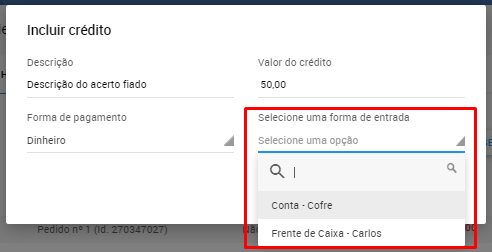 Se o cliente estiver fazendo o acerto em dinheiro aparecerá o campo 'Selecione uma forma de entrada' onde você deverá informar o destino desse dinheiro, que poderá ser a conta Cofre ou um caixa que esteja aberto.