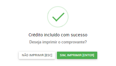 15. Com isso abrirá a janela informando o sucesso da inclusão de crédito e perguntando se deseja imprimir um comprovante, como mostra a imagem abaixo: