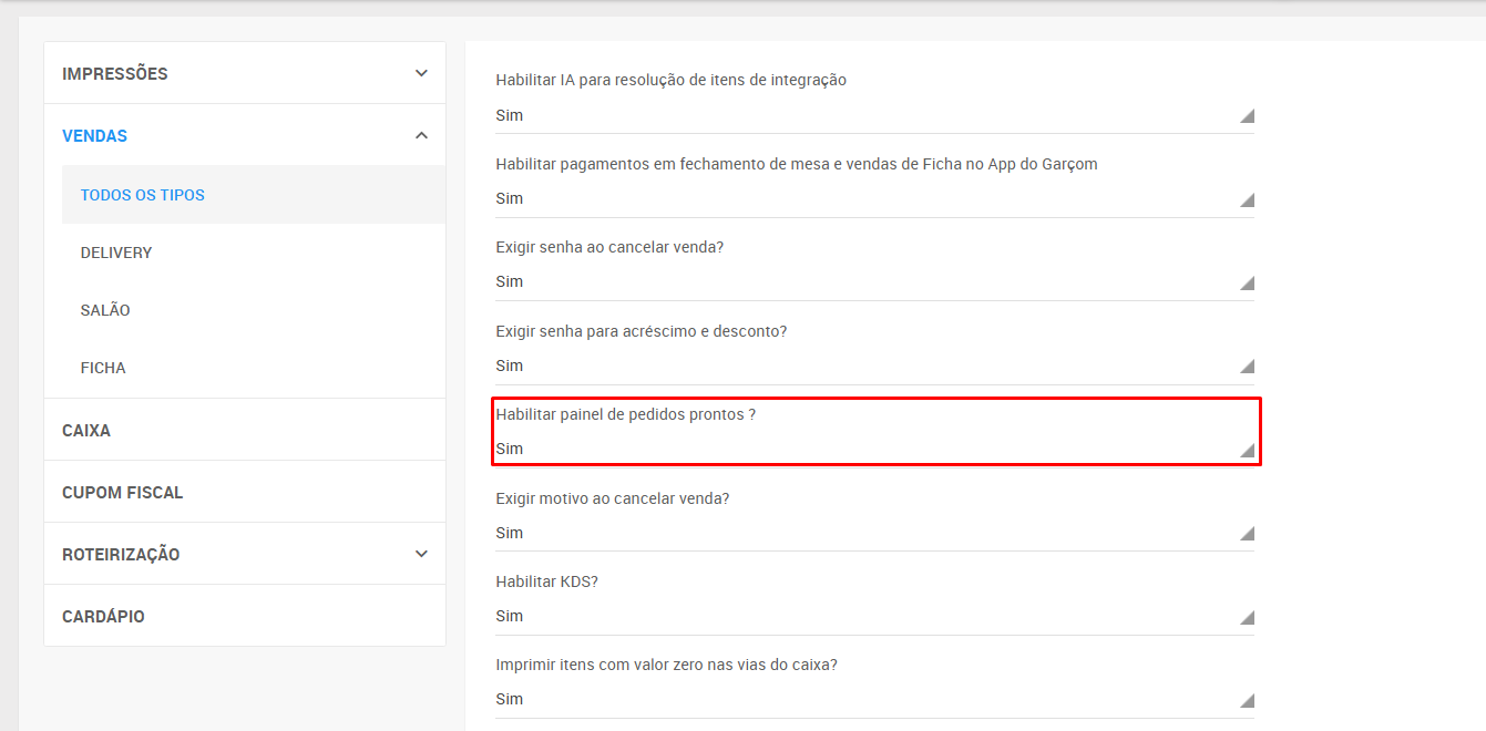 2. Acesse a aba Vendas > Todos os tipos e selecione a opção 'Sim' no campo 'Habilitar check-in de entregadores';