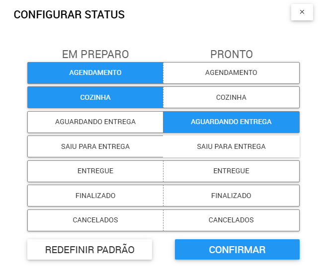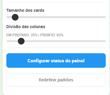 10. Por fim, em 'Configurar status do painel', você pode configurar quais status configurados em sua loja se referem a cada status do painel. No exemplo abaixo, os pedidos em 'Agendamento' e 'Cozinha' do seu Kanban serão visíveis como 'Em preparo' no painel. Assim como os pedidos em 'Aguardando entrega' ficarão visíveis em 'Pronto';
