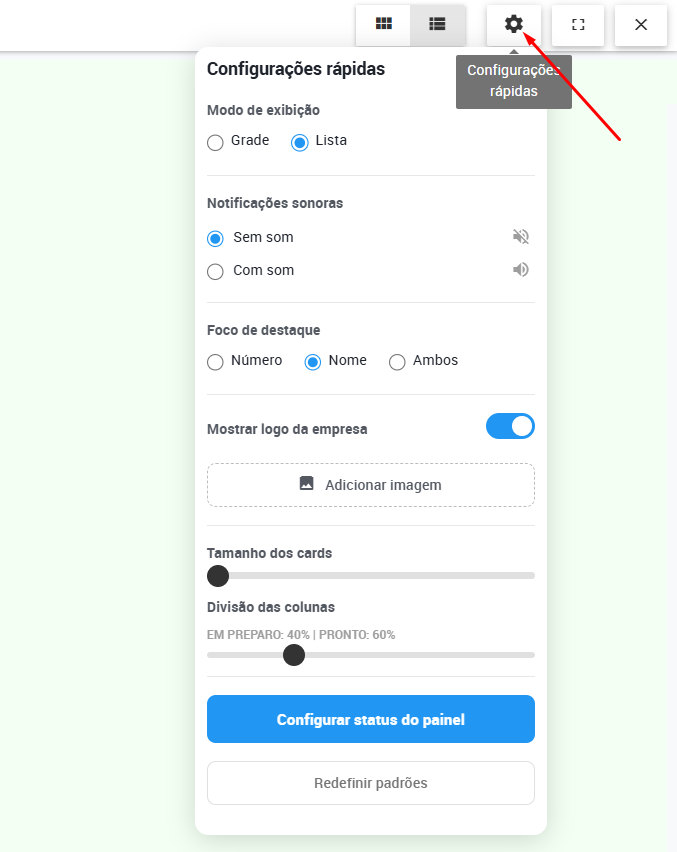 8. No ícone relaciona as configurações, você poderá ajustar o 'Modo de exibição', 'Notificações sonora' (ao alterar o status), 'Foco de destaque' (Número do pedido, nome do cliente ou ambos) e adicionar a 'Logo da empresa';