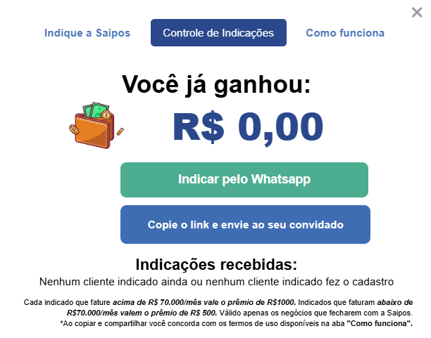 ATENÇÃO! A premiação só será adicionada à sua “carteira” após 60 dias da contratação do sistema pelo indicado. Lembrando que, para indicar, você precisa ser cliente Saipos ativo.