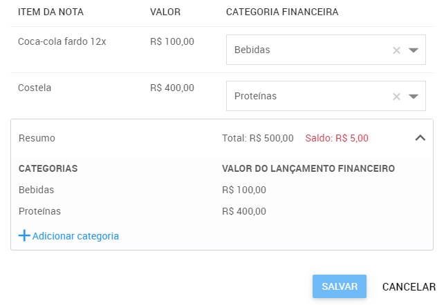8. No exemplo das imagens, há R$ 5,00 do valor total da nota que não são referentes à nenhum produto. Em alguns cenários pode ser relacionado ao frete e manuseio, em outros à impostos e afins. Nestes casos, é necessário também haver uma categoria financeira vinculada. Para isso, clique em '+ Adicionar categoria';