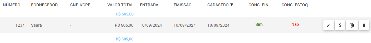 11. Ao volta na tela de notas de entrada, a coluna 'CONC. FIN' já estará como 'Sim';