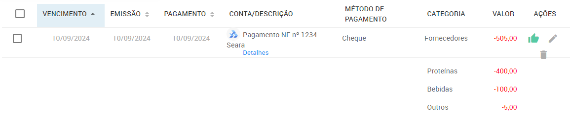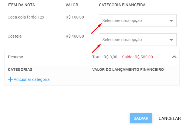 OBS: Por padrão, o valor total é exibido como categoria 'Fornecedores', mas ele não é contabilizado nesta categoria nos relatórios DRE e Fluxo de Caixa para evitar duplicatas.