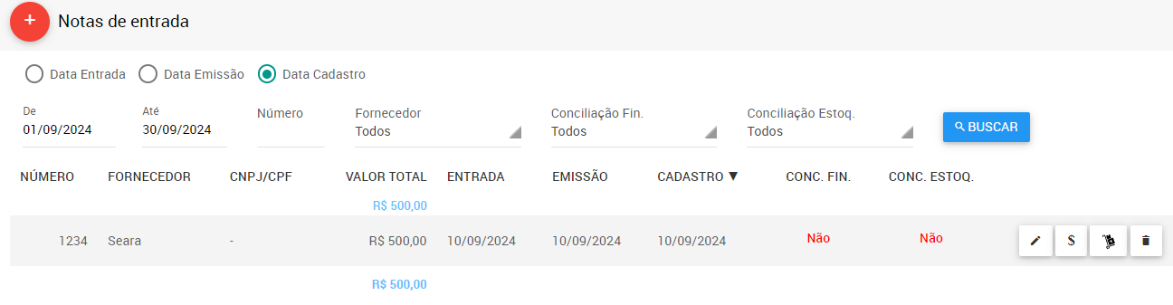2. Para realizar a conciliação financeira, clique no ícone de cifrão 💲 ao lado da nota que deseja;