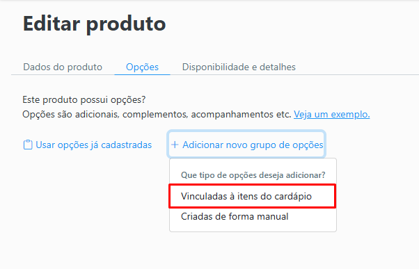 Vinculadas à itens do cardápio: Será possível vincular produtos já cadastrados