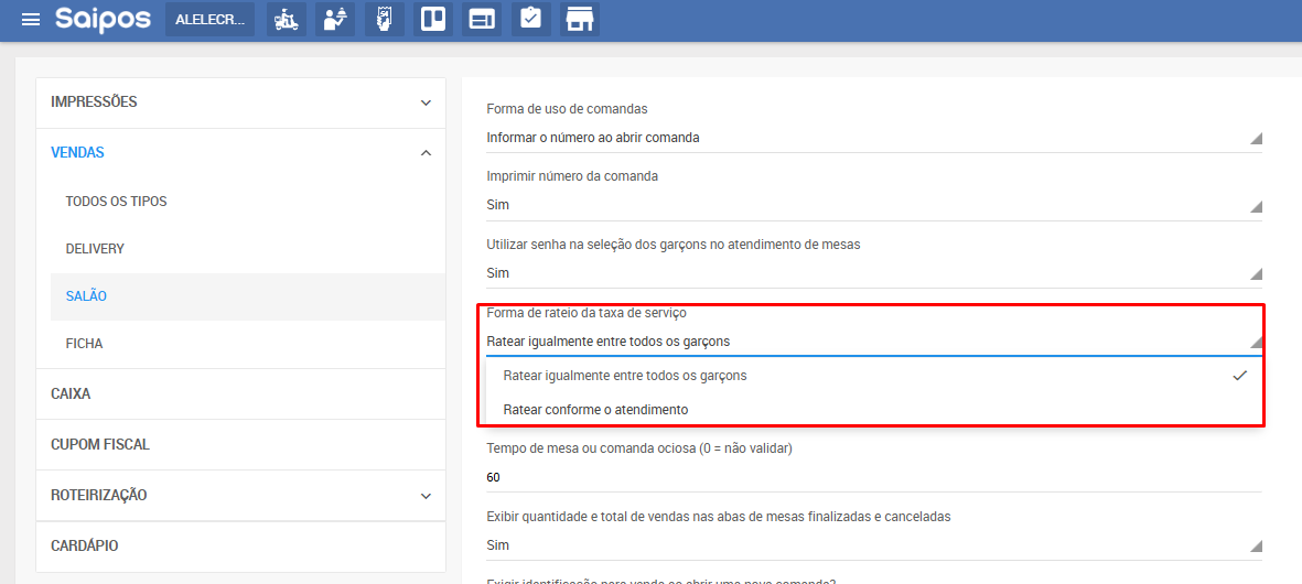2. Em Vendas > Salão > Forma de rateio da taxa de serviço selecione a forma de rateio conforme sua necessidade: