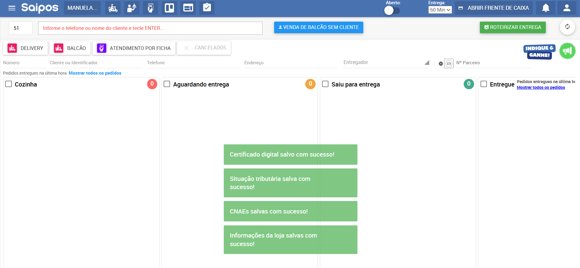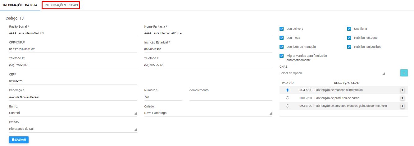 ATENÇÃO! A Saipos não realiza cadastro de dados fiscais ou demais ajustes junto a SEFAZ. É necessário validar com sua contabilidade.