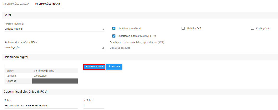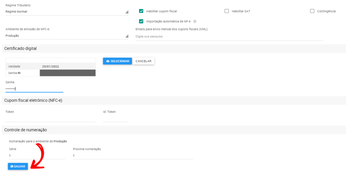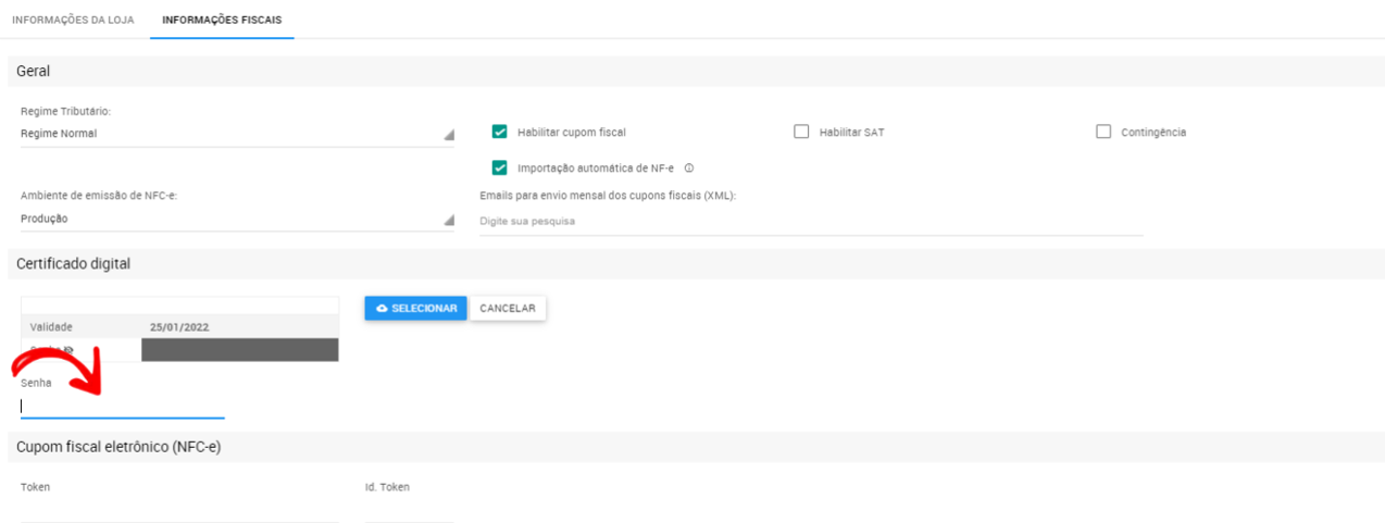 5. Com isso, o seu Certificado Digital A1 estará anexado nas informações fiscais. No campo 'Senha', insira a senha do seu Certificado (geralmente é enviada junto dele pela sua contabilidade);