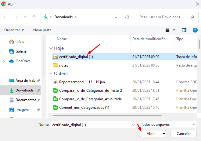 4. Encontre o arquivo em formato .pfx ou .P12 do seu certificado digital e clique em 'Abrir';