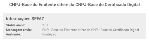 - CNPJ-Base do Emitente difere do CNPJ-Base do Certificado Digital