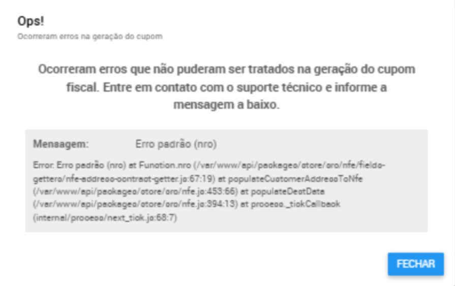 Este erro ocorre quando o campo 'Número' no endereço está incompleto, impossibilitando a emissão do cupom, é necessário editar a informação no endereço que não possui o número e gerar com data e hora atualizada.