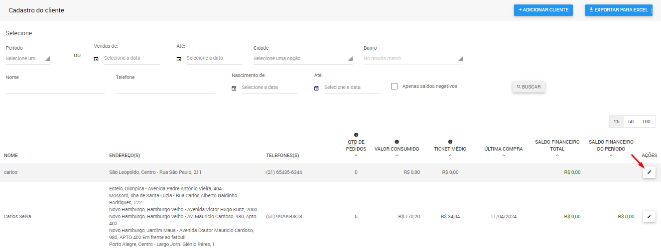 3. Para editar o cadastro do cliente basta clicar no lápis de edição ao lado do mesmo, como destaca a imagem abaixo: