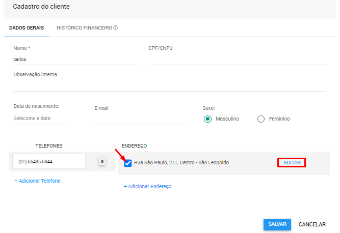 4. Para editar um endereço especifico do cliente clique em 'EDITAR' ao lado ou clicando na flag indicada para desabilitá-lo;