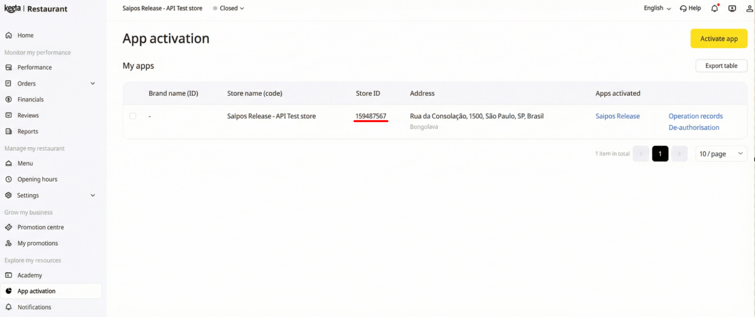 5. Ainda no gestor da Loja, acesse 'App activation', onde haverá uma tabela com o campo Store ID. Copie esse código;