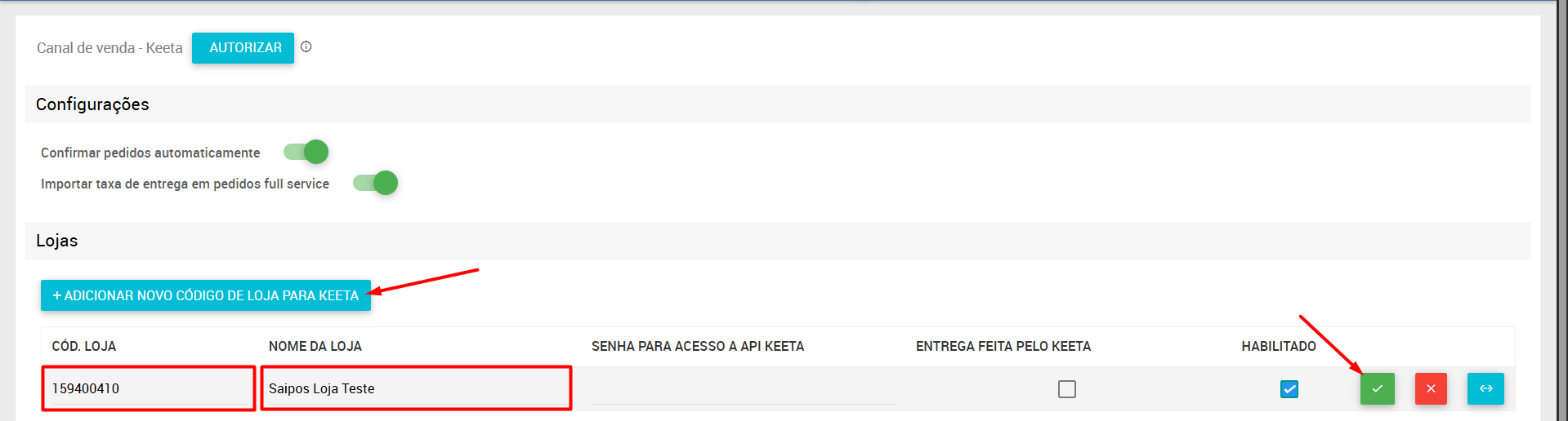 6. Na Saipos, acesse o Menu > Canais de Vendas e integrações > Configurar e clique em 'ADICIONAR NOVO CÓDIGO DE LOJA PARA KEETA'. No campo 'CÓD.LOJA', preencha com o código da loja (store ID) na Keeta. Em 'NOME DA LOJA', preencha o nome da loja na Keeta. Marque o checkbox de 'Habilitado' e clique no botão ✅ para concluir;