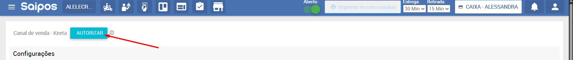 É possível realizar a abertura e fechamento da Keeta diretamente pela Saipos, através dos 'Status dos canais de venda';