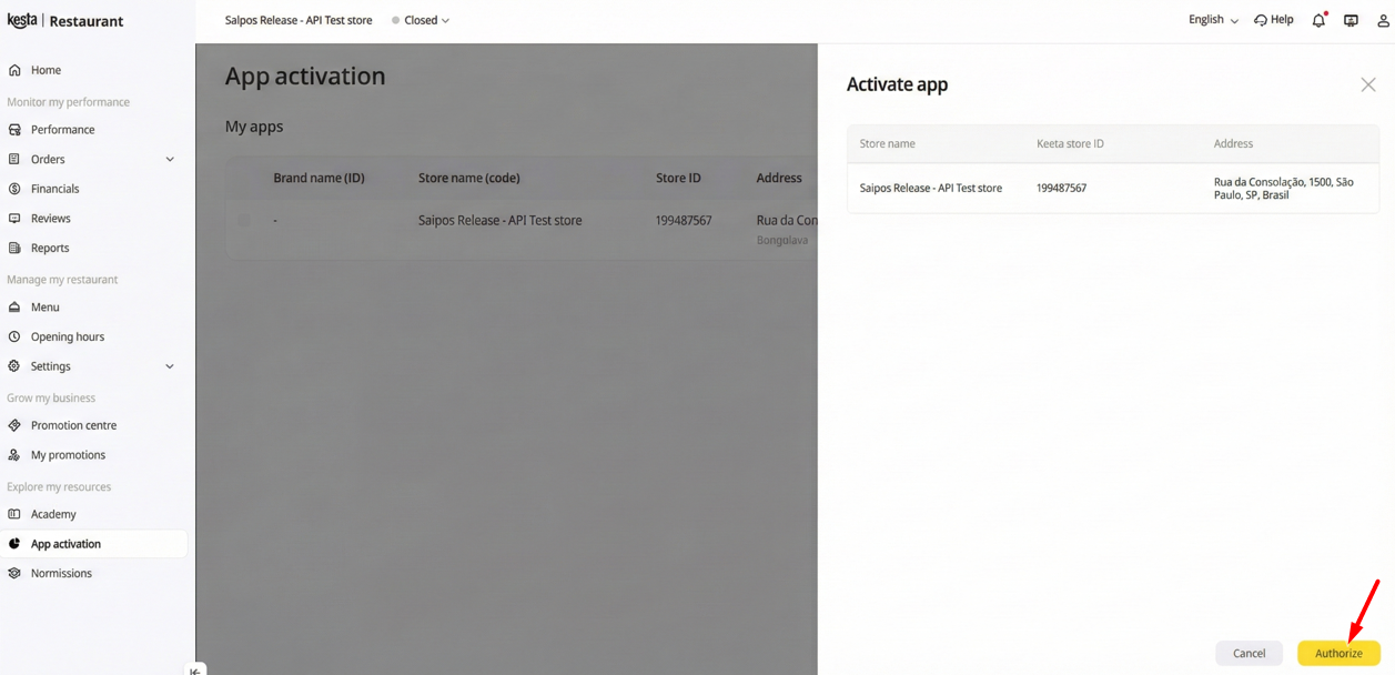 3. Selecione 'Autorizar'. Você será direcionado para o gestor da loja Keeta;