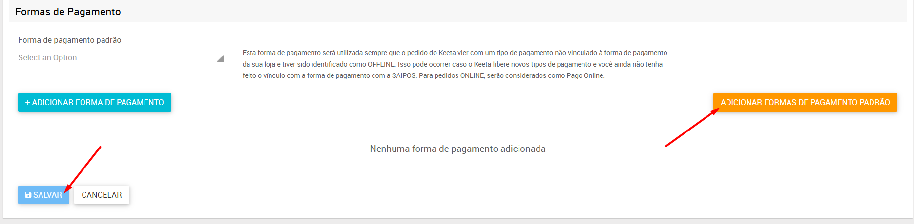 7. Clique em 'ADICIONAR FORMAS DE PAGAMENTO PADRÃO' e finalize clicando em 'SALVAR';