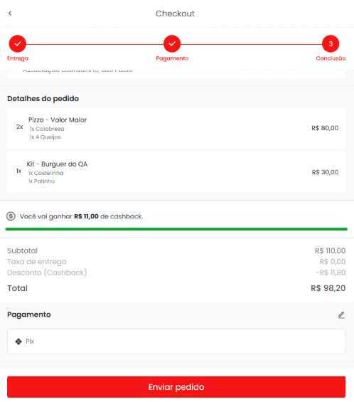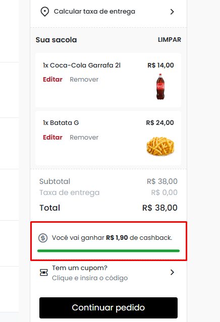 O cashback calcula apenas o valor dos itens pagos, sem considerar descontos e taxas de entrega.
