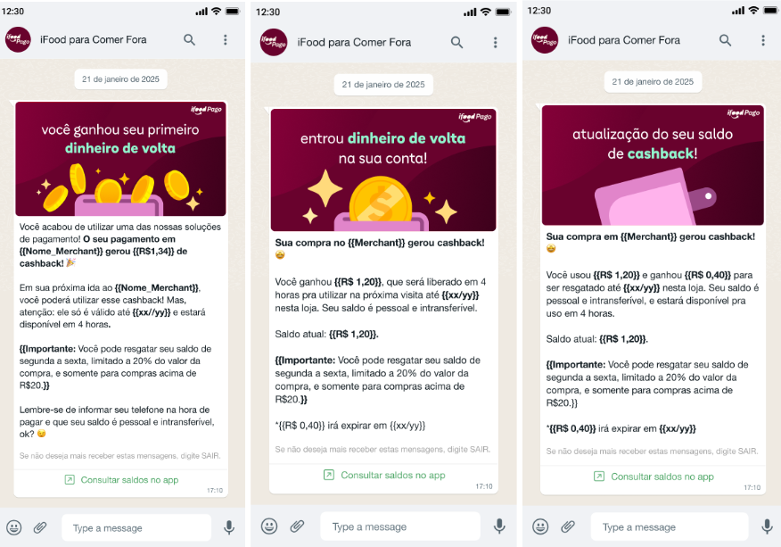 5. Após a compra, o cliente recebe uma mensagem no WhatsApp informando o valor do acúmulo ou resgate;