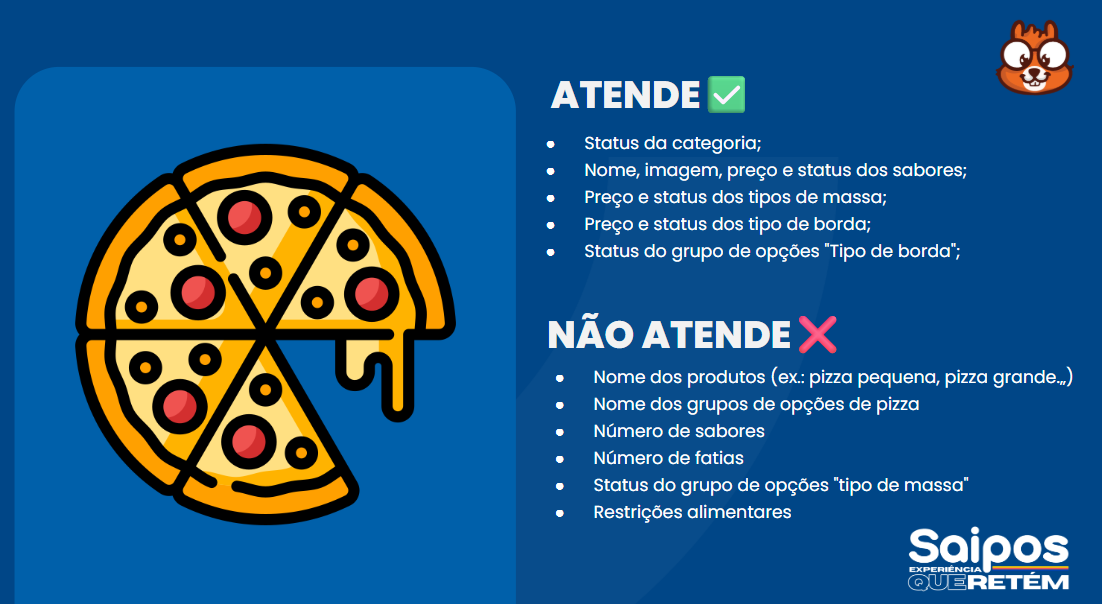Essa importação não funcionará quando o produto se trata de um combo no iFood, pois a Saipos utiliza uma estrutura diferente de cadastro, impedindo a importação e edição. Ademais, os produtos do tipo 'Pizza' no iFood também possuem limitações por conta dessa estrutura: