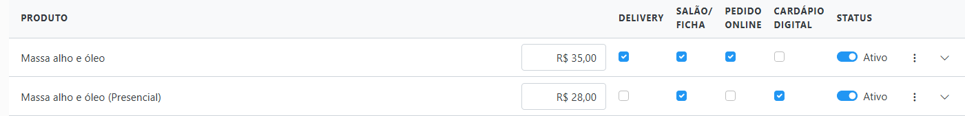 CARDÁPIOS COM PREÇOS DIFERENTES